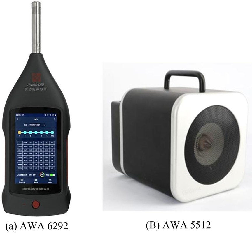 AWA6292型多功能声级计如图2(a)所示,是采用数字信号处理和物联网技术的新一代手持式声学测量仪器,性能符合GB/T 3785.1/IEC  61672-1对1级声级计和GB/T 3241.1/IEC 61260-1对1级滤波器的要求,可以选择工业噪声测量、环境噪声测量、职业卫生噪声测量和建筑声学测量等模块。当选用建筑声学测量模块时,配置总值积分测量、倍频程和1/3倍频程滤波器、混响时间测量和STIPA测量等软件模块,可以完成大多数建筑声学测量项目,尤其适用于厅堂和室内场所的声学和扩声特性测量。